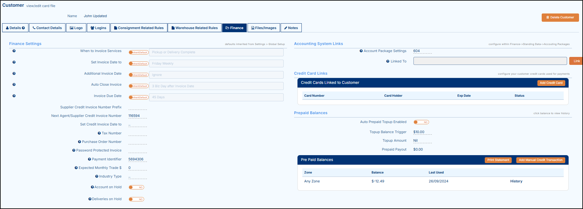2. Once the consignment is created, click on the consignment number to see the consignment detail page and then click on the Finance tab as shown below.