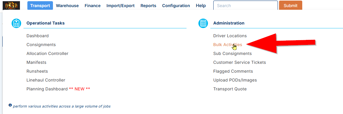Access: Transport → Administration → Bulk Activities