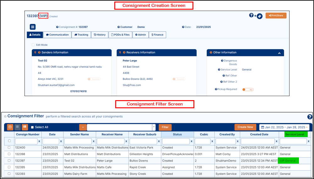 For Example: Once enable this toggle, and when creating a consignment, this VIP will reflect along with consignment number, and on Consignment Filter screen, you can see the VIP on Service level also as shown below.