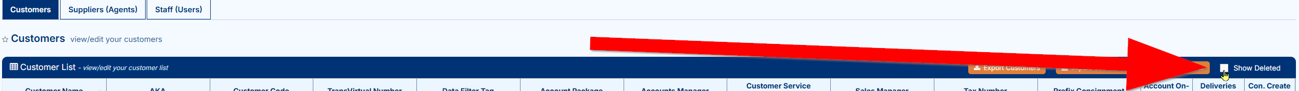 3. In the top right-hand corner of the page, there is a tick box labelled "Show Deleted". If you select this tick box it will refresh the Customer List and any deleted Customers will be highlighted in orange.