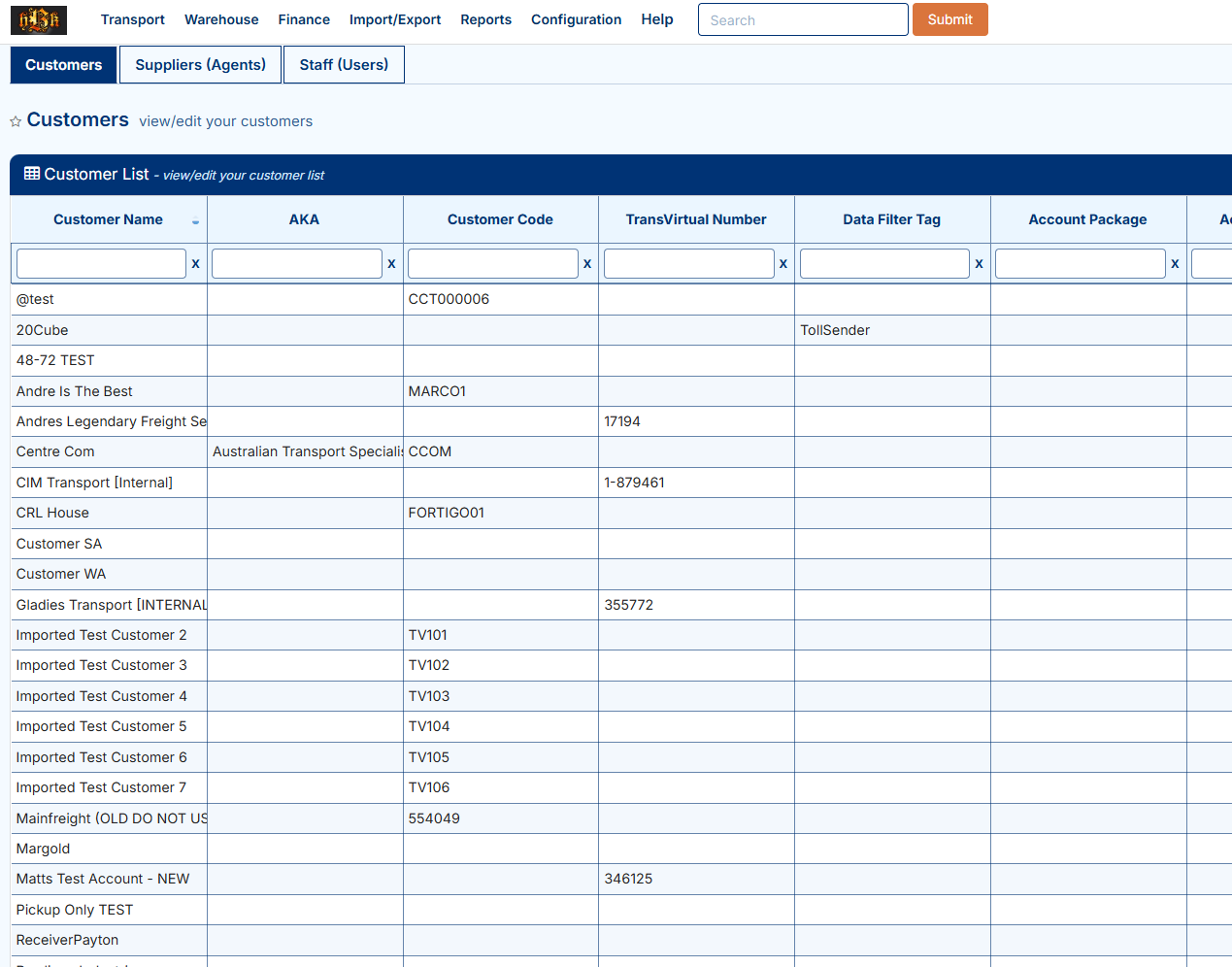 1. To open the Customers List page, go to Transport > Configuration & Setup > Card Files (Customers/Suppliers/Staff), click on the Customers tab, the Customer list will display.