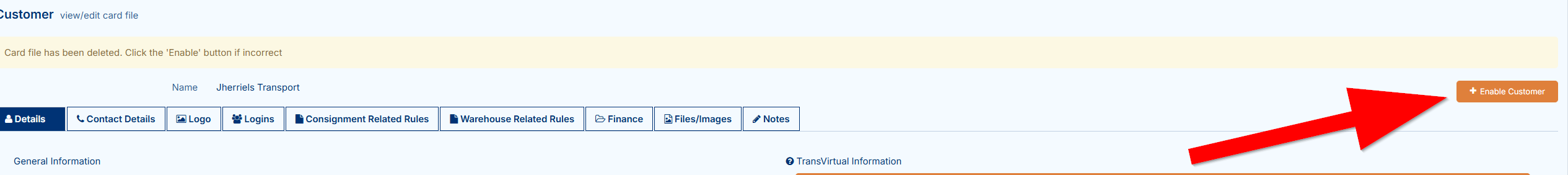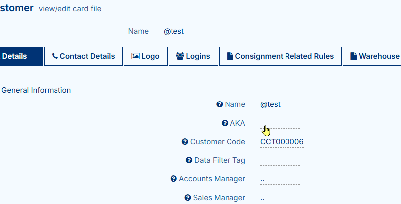 When you double-click on a customer's name in the Customer List, you will be directed to the Customer card file page where you can see edit/add Customer Details, Contact Details, Logo, Logins, Consignment Related Rules, Finance, Files/Images and Notes as shown below: