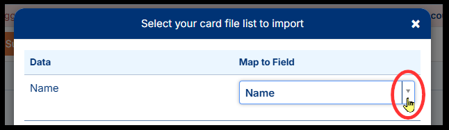 2. Either click on the box and select the file or drag and drop the file in the selected box and then click on the next button, a new pop-up will prompt where you can select the card file and map the Name (along with other infos) with the help of the drop-down button: