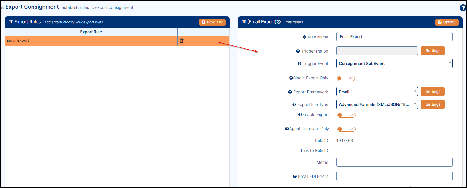 Trigger Period: Controls how often the rule checks for pending exports. Click Settings to adjust. Default is every 2 minutes.