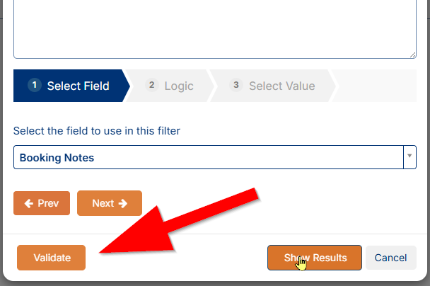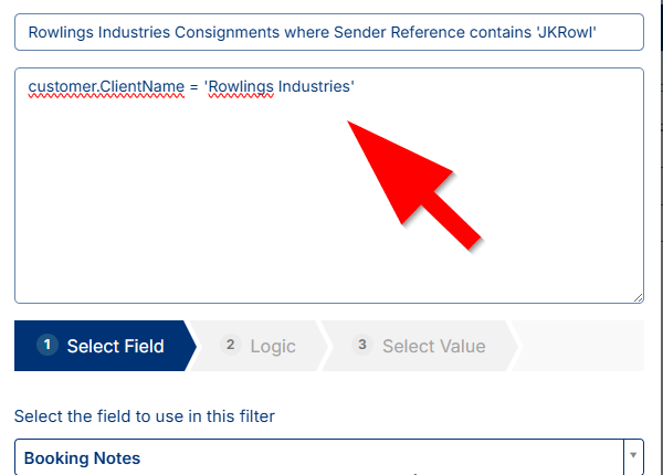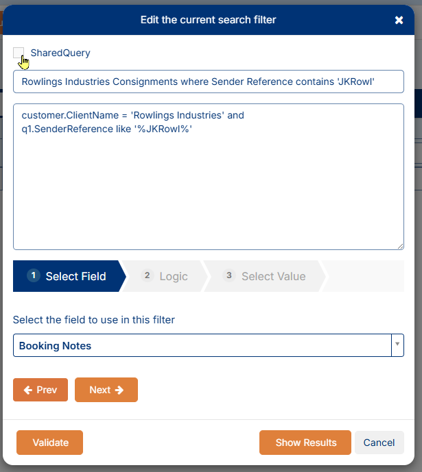 This example filter is now ready to go - it is currently setup to return consignment results where the customer listed is Rowlings Industries and the sender reference contains JKRowl. From here it is advisable to use the Validate button at the bottom to ensure the logic is sound - no errors: