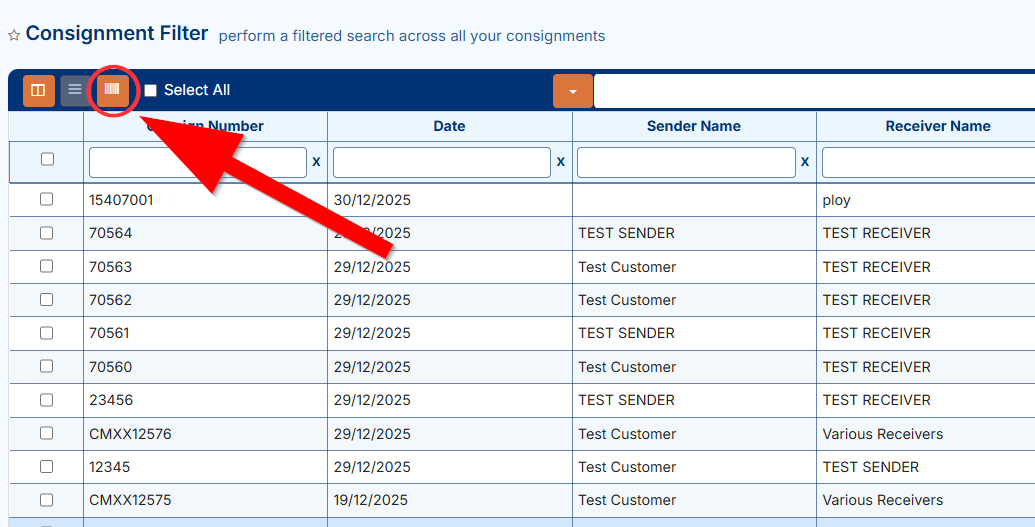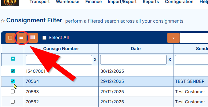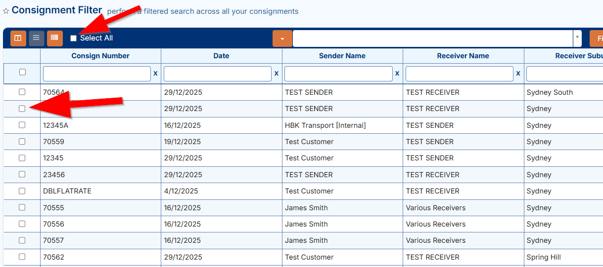 1. Select consignments using checkboxes on the left, or click Select All