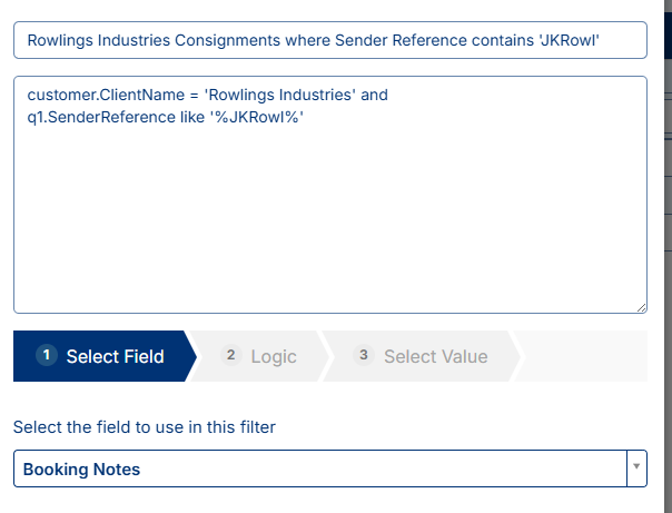 Our example also calls for criteria related to Sender Reference - we are wanting to only see consignments where the sender reference contains 'JKRowl". Repeat the same process as above again using the data filter builder at the bottom of the window. This time however, step 1 will be Senders Ref, then click Next. Step 2 will be Contains, then click Next. Step 3 will be to enter the text required (JKRowl) and then click Add Rule. This will then add more logic/text to the data filter like so: