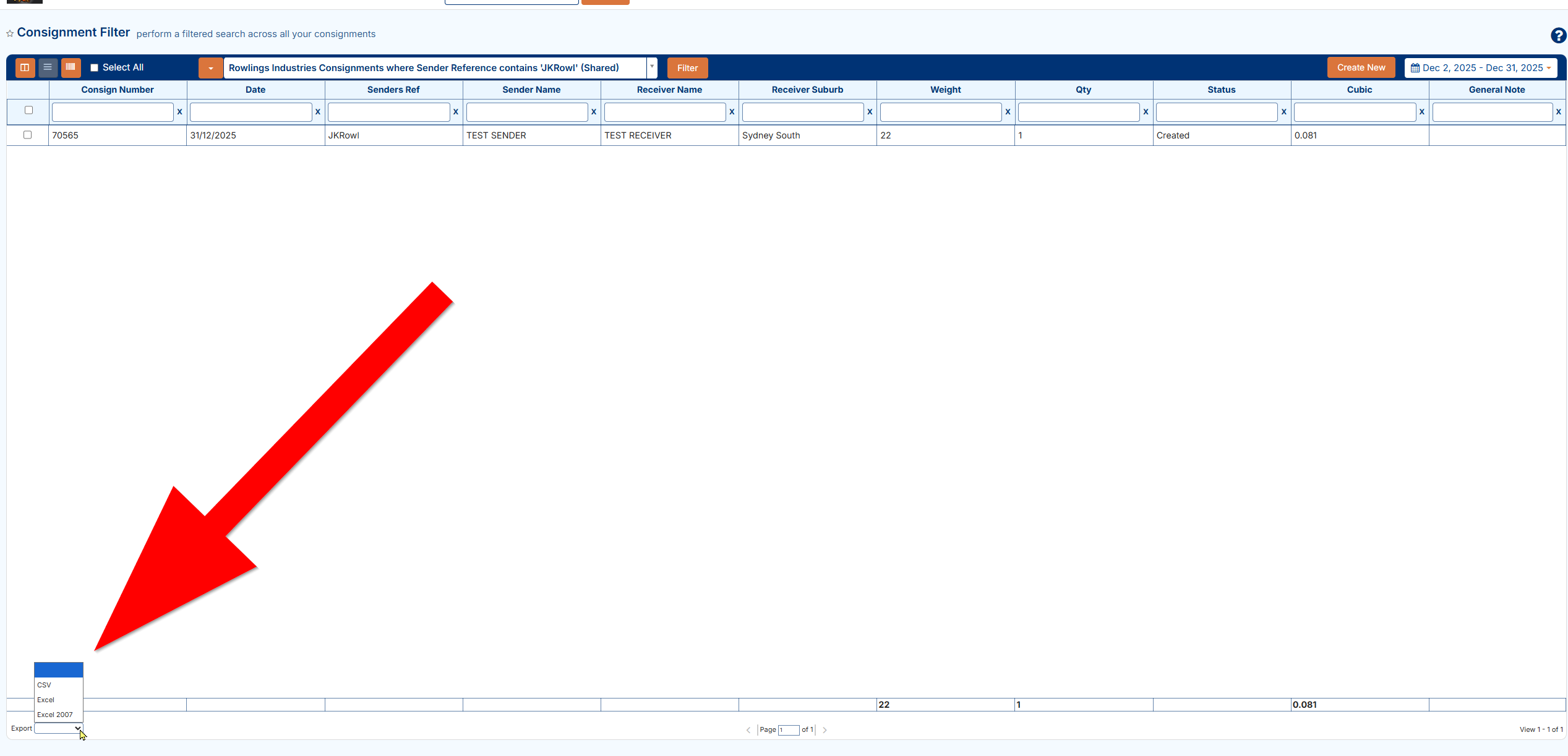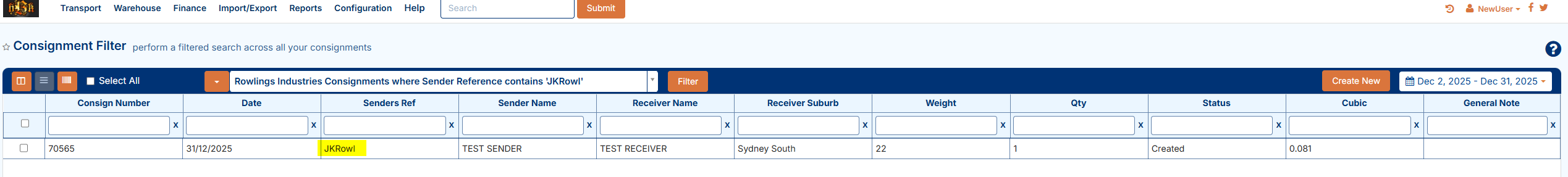 In the above the search filter has returned only 1 consignment result as there must only be one consignment in this account where the customer is Rowlings Industries and the sender reference contains JKRowl.