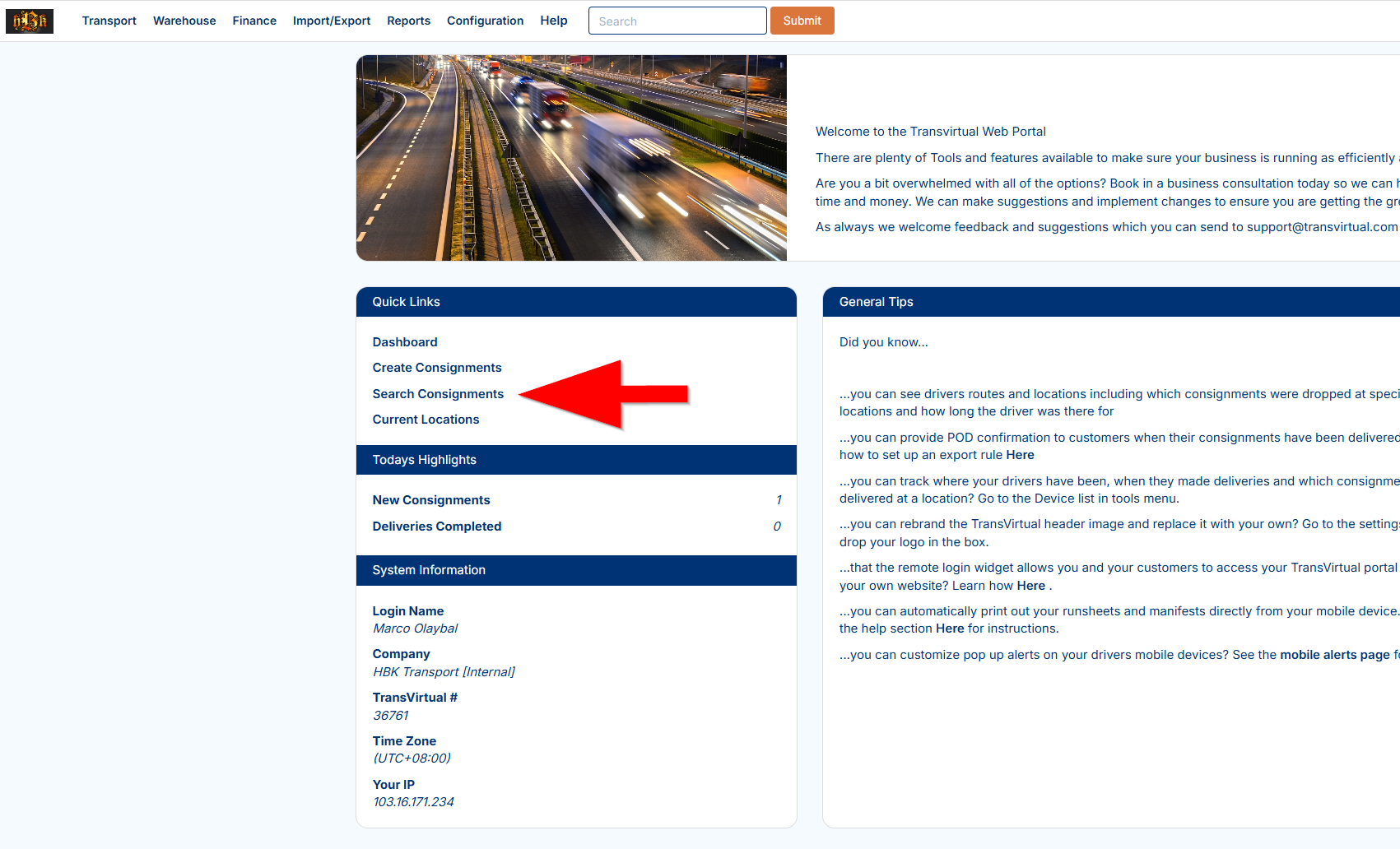 Or use Quick Links on the home page → Search Consignments