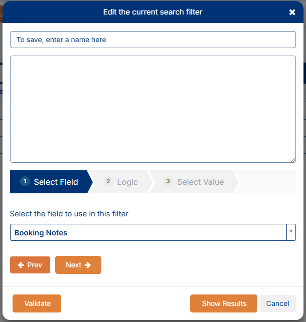 4. Once you have entered the name of your filter, you then need to add logic or criteria for what will be involved in the search - what the search parameters are; how the system will search for and return results etc. Following on with this example, the first step would be to use the data filter builder at the bottom of this window - we need to add in the customer name and make it part of the search query. Use the field Customer Name from step 1 and then click Next: