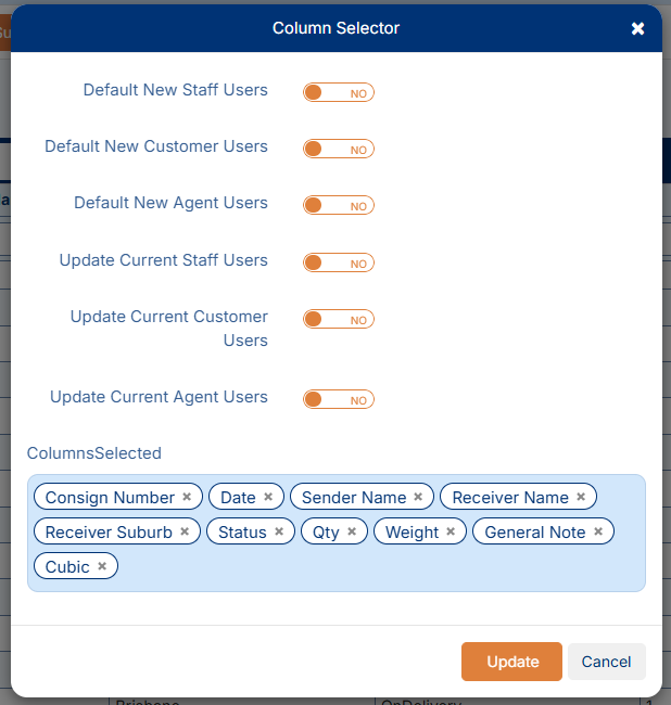 Default New Customer Users - Sets the current columns as default for new Customers.