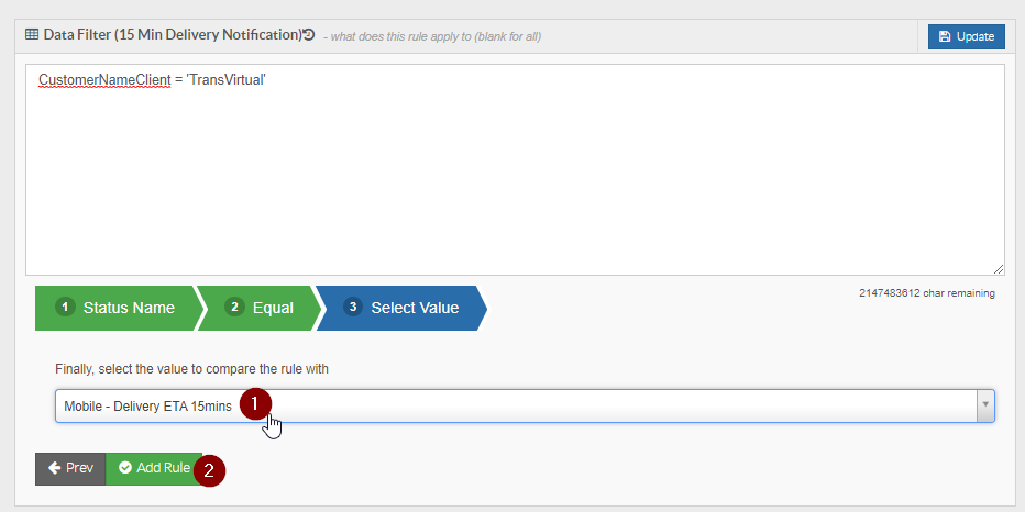 Once setup, the rule will fire and work automatically to apply to any consignments where TransVirtual is the customer (for this example) and the current status is Mobile - Delivery ETA 15 Mins.