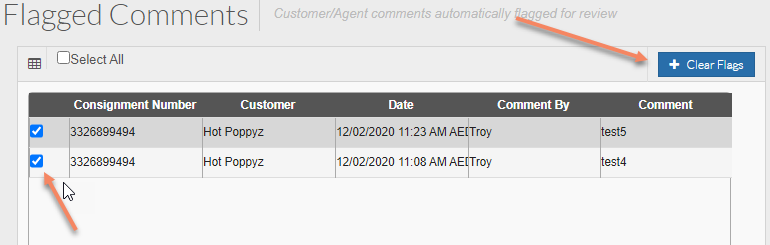 You can bulk clear flags by ticking the relevant boxes next to the consignments, and clicking the 'Clear Flags' button that appears as below
