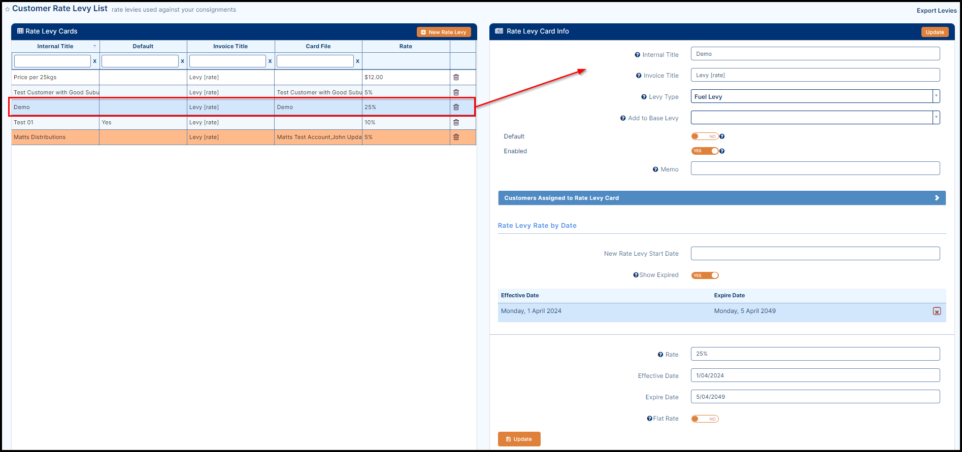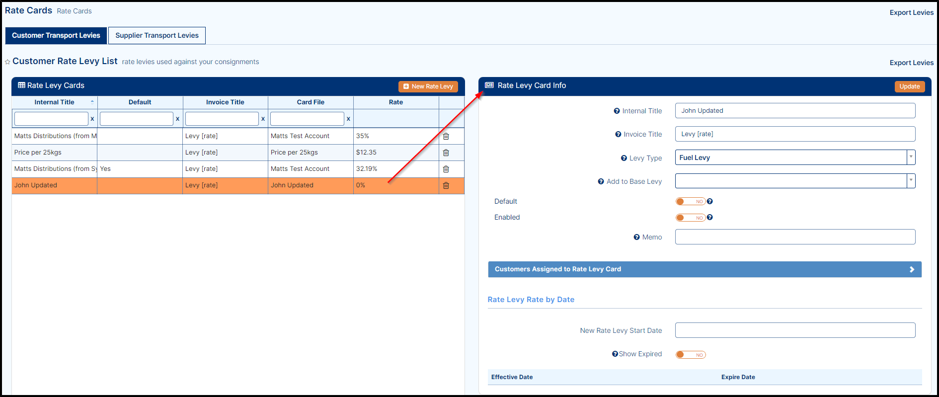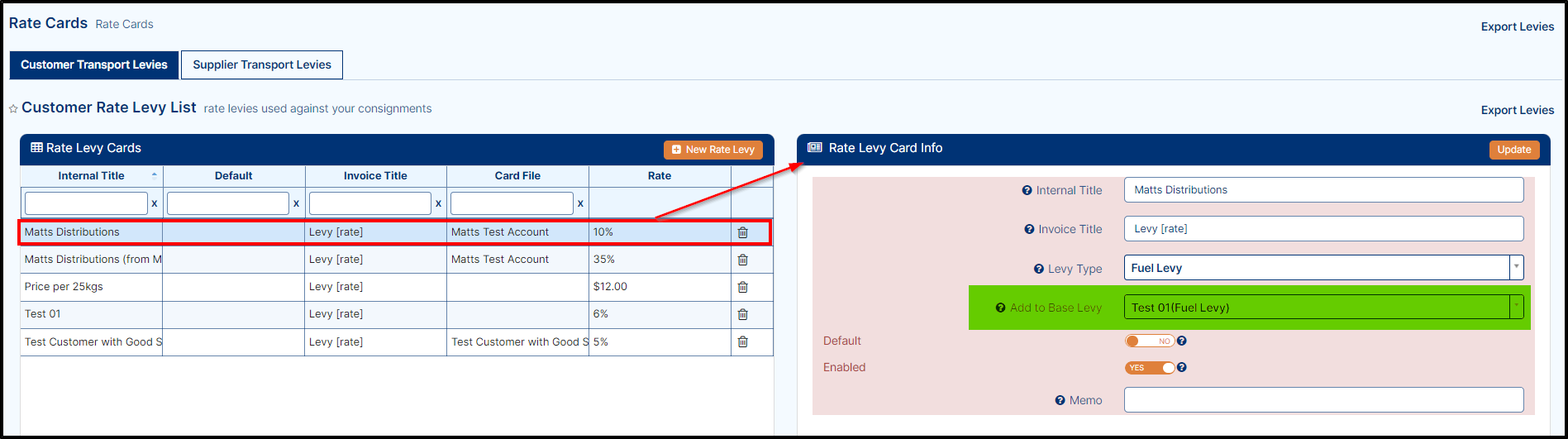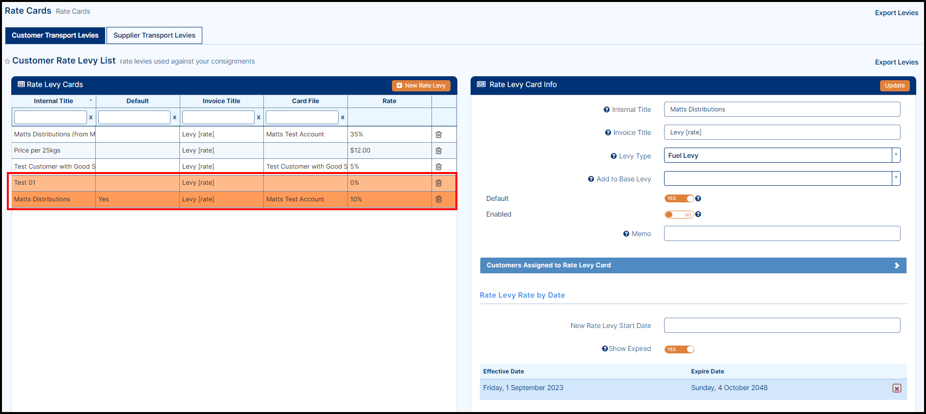 2. In the above screenshot as you can see, there are 2 levies i.e., the bottom line is the customer specific fuel levy as denoted by the Card File column being populated (the levy the customer is actually being added to - this is for customer Matt Distributions the top of the line is the base levy that will be what the customer specific levy is added to (to create this levy, simply create as per normal and then just remove all customers from it - click Customers Assigned to Rate Levy Card and then use the red x to remove all customers from this base levy).