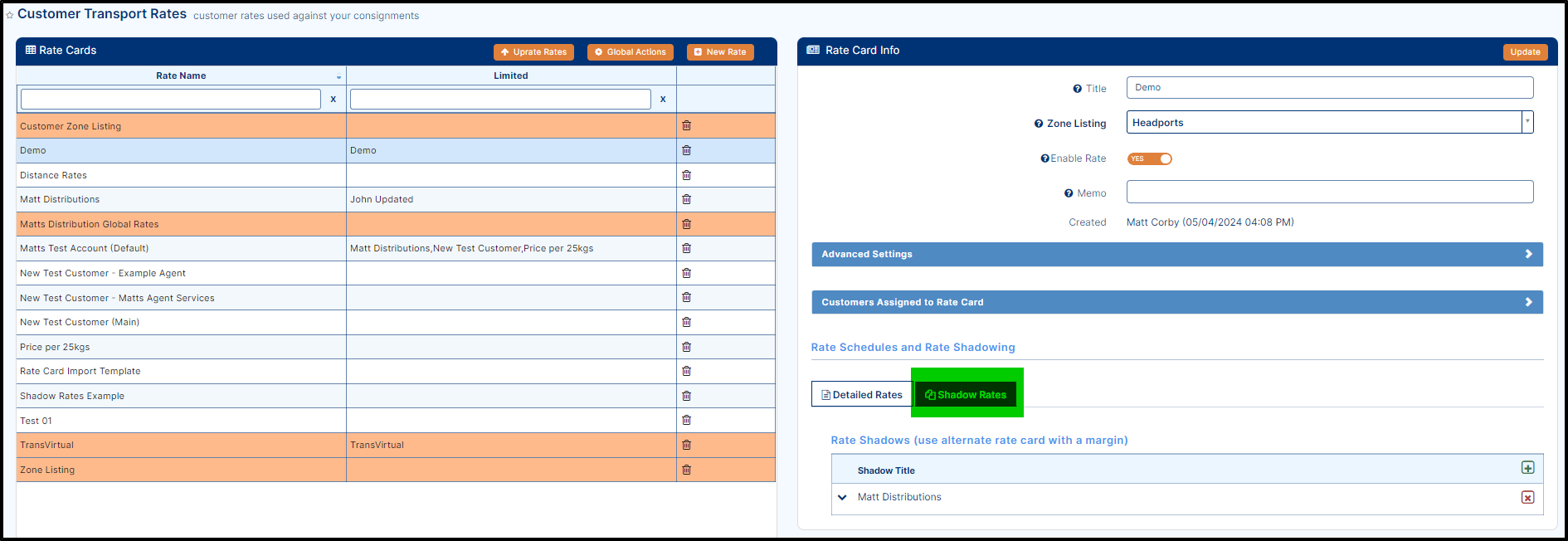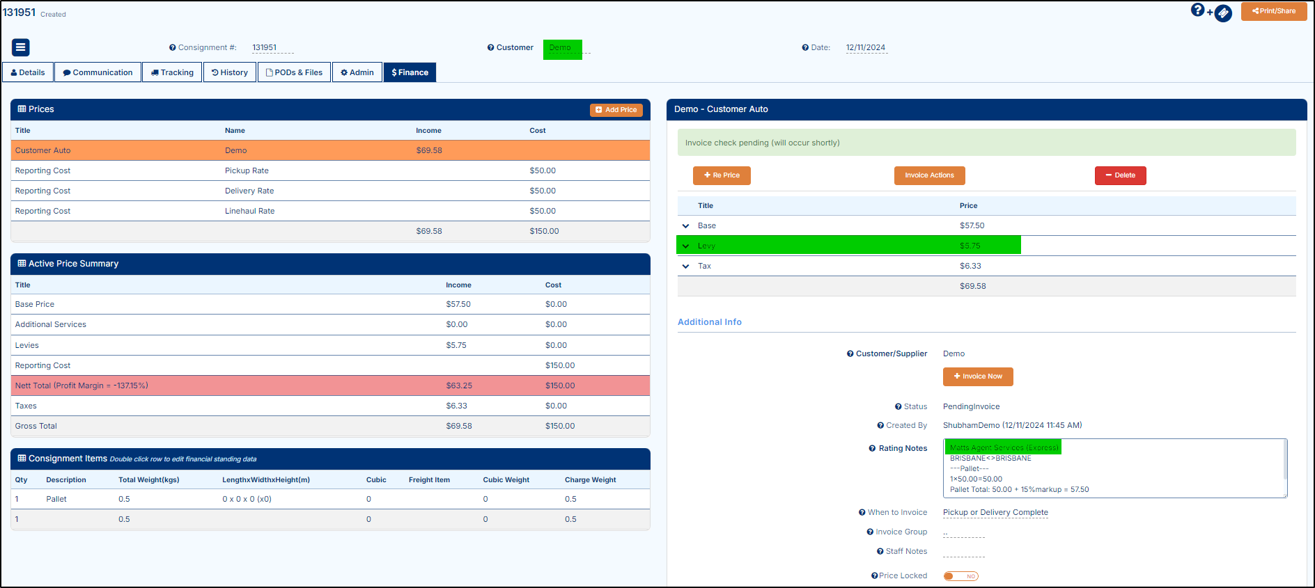 8. In the above consignment you can see that this consignment is for customer Demo. The rating notes show that the rate card being used to price the consignment is Matt Distributions, which is an shadow rate card. As a result, the fuel levy that the customer is being charged is the same as what the agent linked to the rate card acquires.