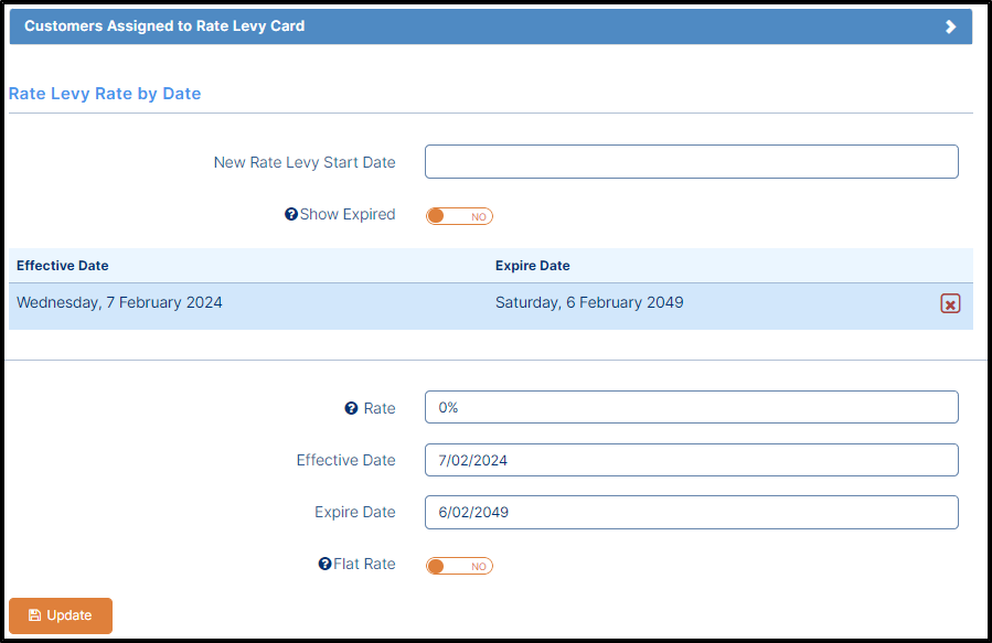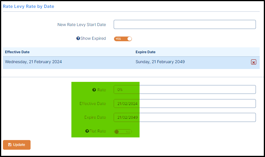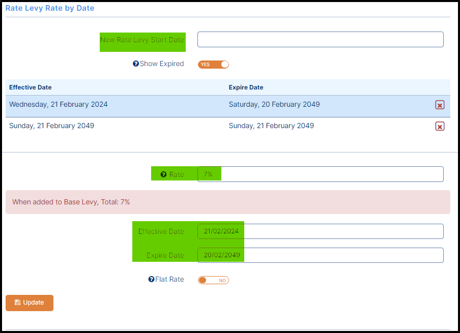 5. Set the effective date-when you want this levy to start applying from. Ensure that the rate-what this levy will charge at is also entered; set as either a flat rate or as a percentage.
