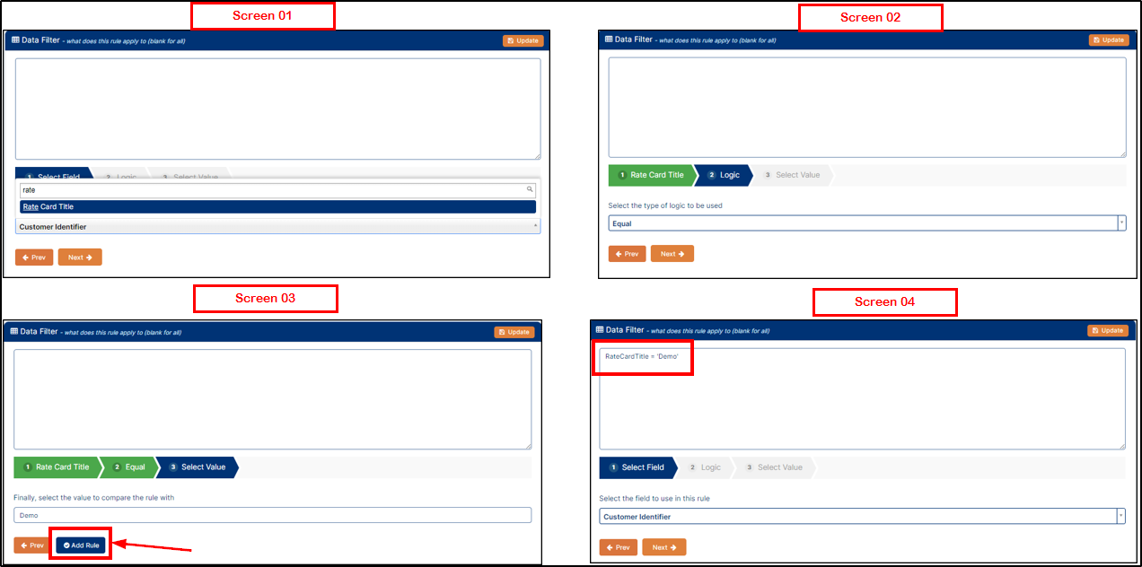 In this example we select Rate Card Title (Refer screen 01) in the Select Field, Equal(Refer screen 02) in Logic and Demo (Refer screen 03) in the Select Value field