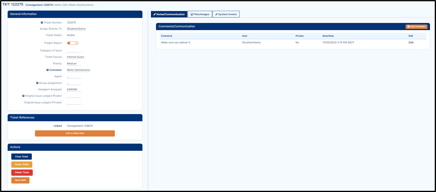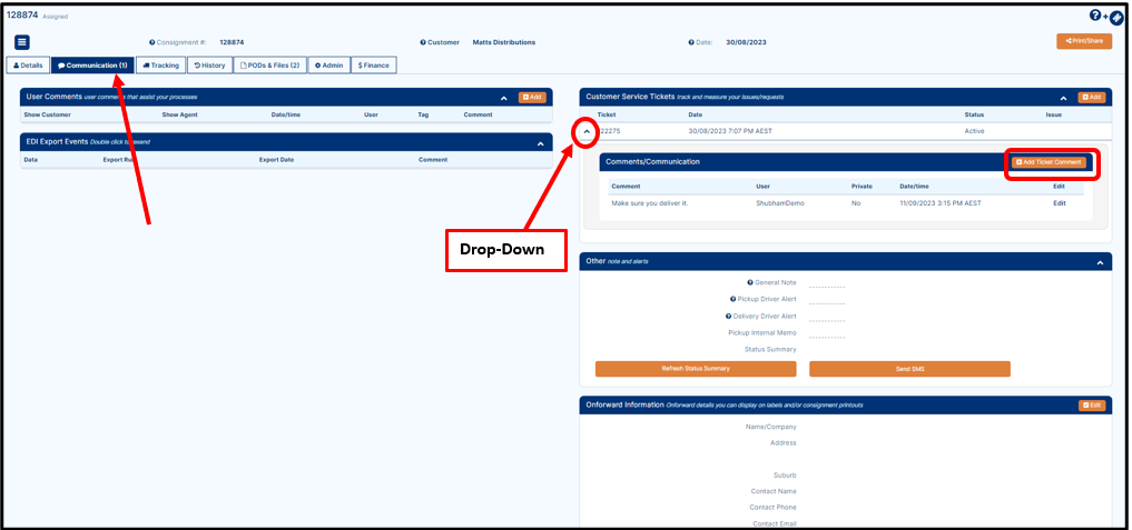 Staff: Your staff will mostly (depending on company process) be the ones creating these tickets. You may have an email address that the customer can contact to raise any concerns about the consignment, or you can allow them the appropriate access as shown above. Your staff can also follow the above process, however there are more options for them, they can use the flagged comments screen, and they will also have a box within the Communication tab that allows them to directly create a Customer Service Ticket.