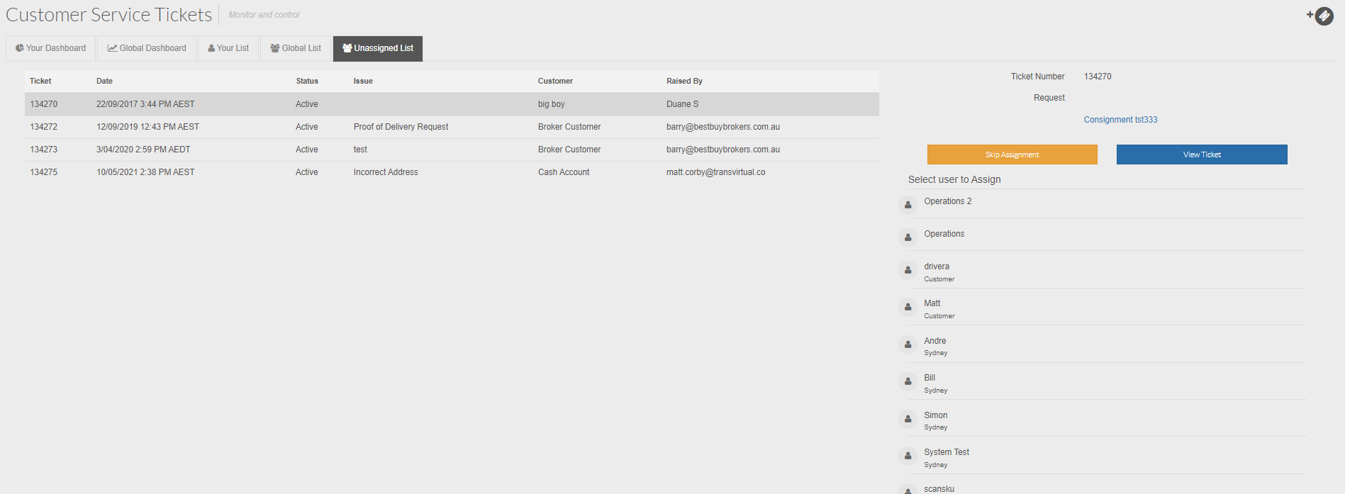 Search - This page is a standard filter screen where you can search for any Customer Service Tickets in your TransVirtual account, just like you would in the search consignment screen. This page will look similar to the below: