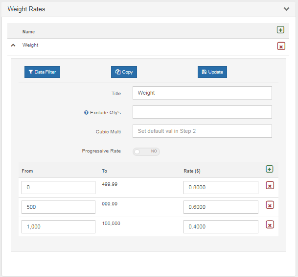 Thirdly you can setup rates based on weight which are typically used in conjunction with a Flat or Basic rate as above, in this example we are charging $0.80 per kilo if the consignment weight is less than 500kg and so on. We can also use progressive rates which will charge $0.80 up to 500 then $0.60 up to 1000 and so on