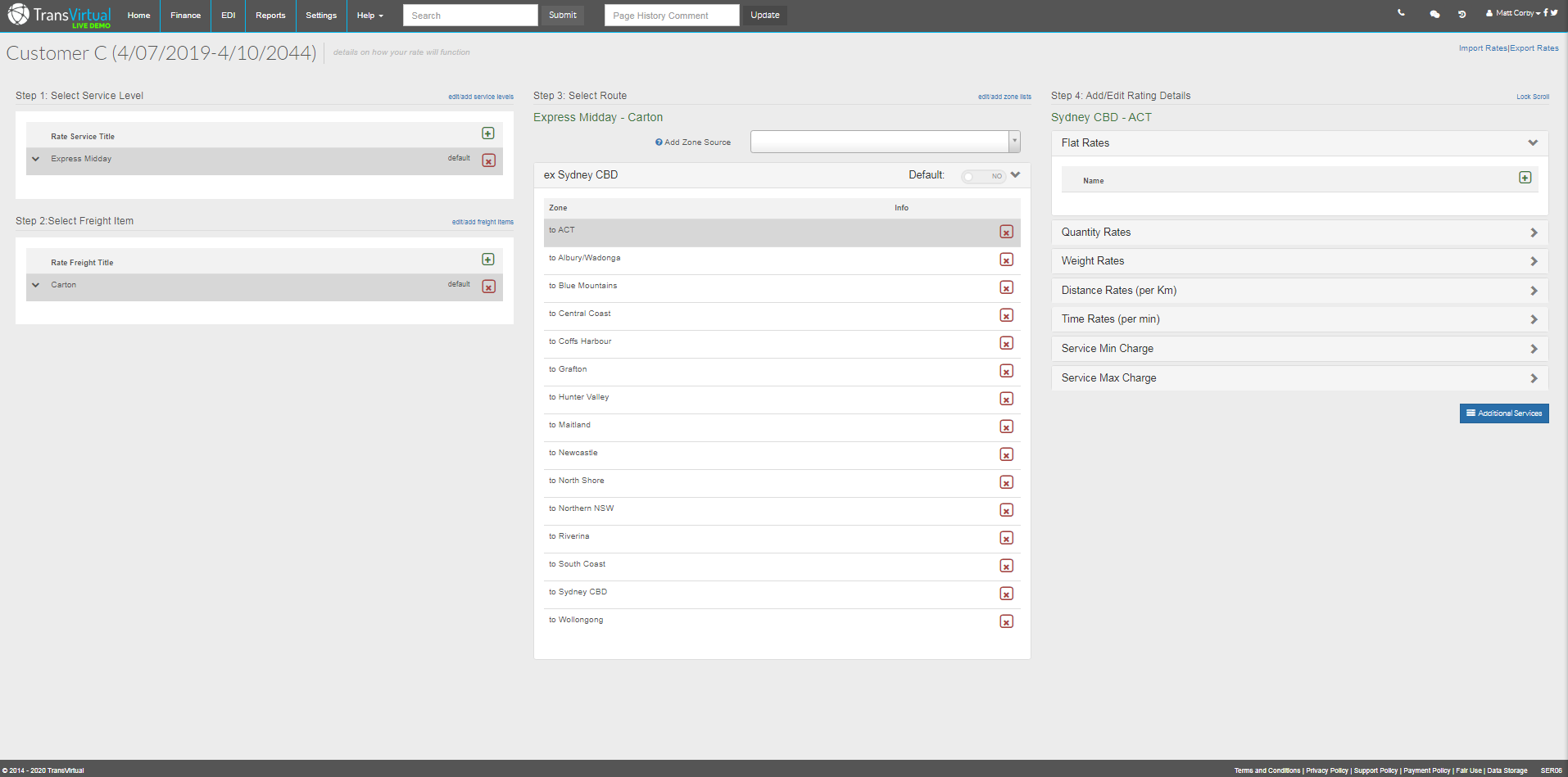 In Order to setup a rate card you will need to have at least one service level, Freight Items e.g. Cartons, Items Pallets etc as well as a zone listing in place which separates different areas being suburbs or Postcodes for different prices