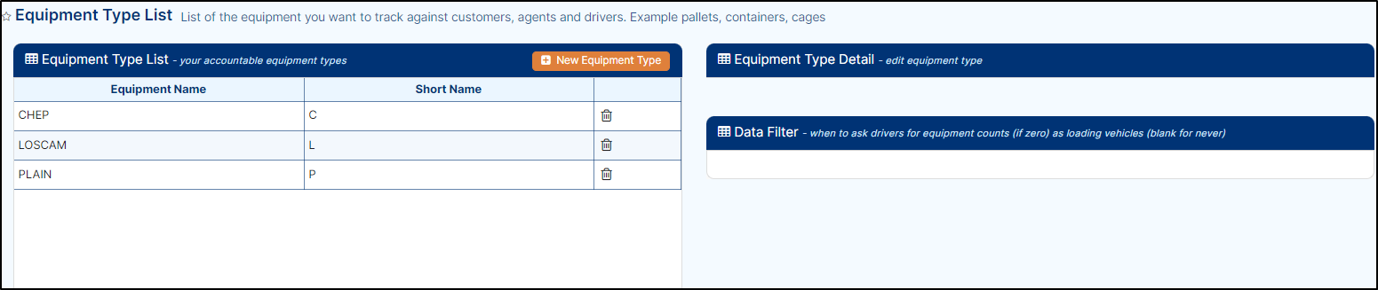 In TransVirtual you are able to setup equipment types to track against customers, agents and drivers. Examples being pallets, containers, cages, etc.