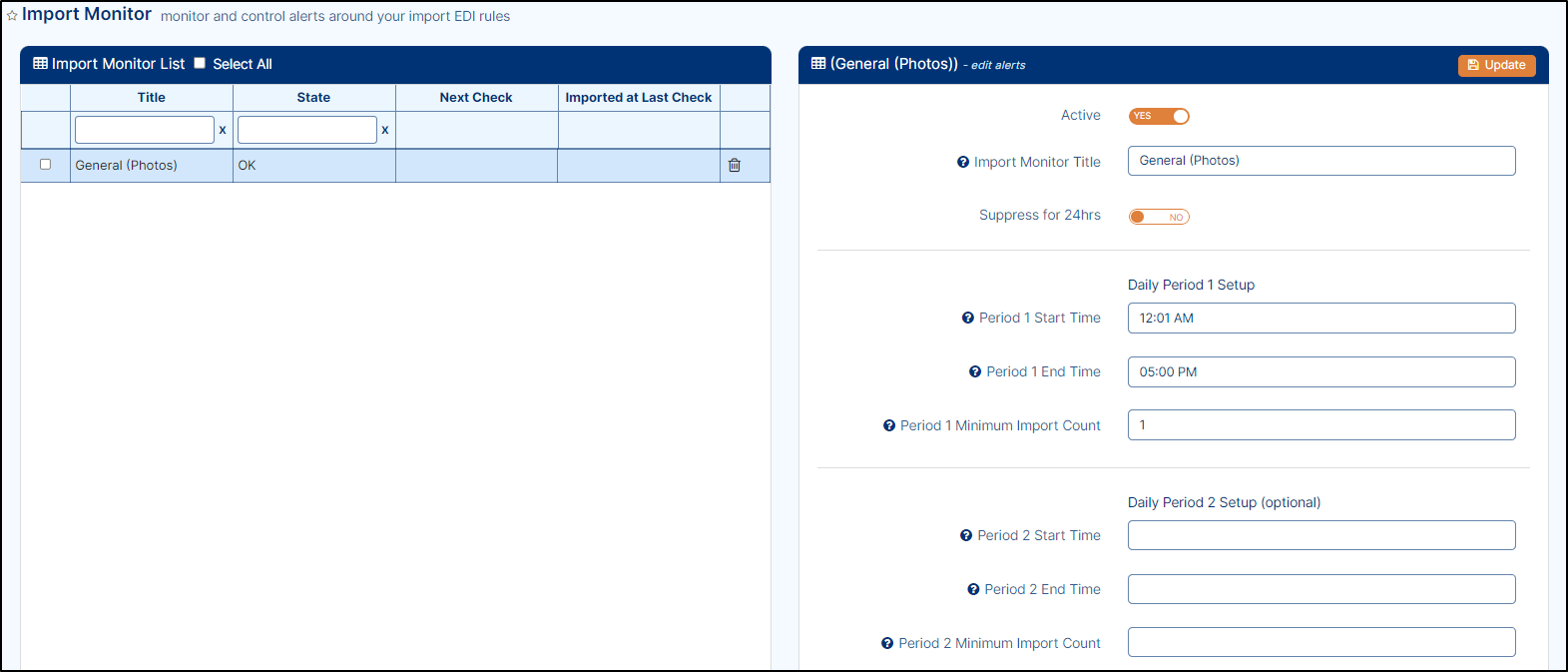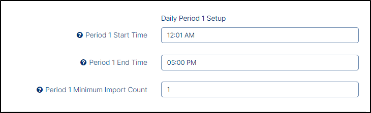 b. The "Period 1 End Time" field is used to indicate when you want the import monitor to stop monitoring this import.