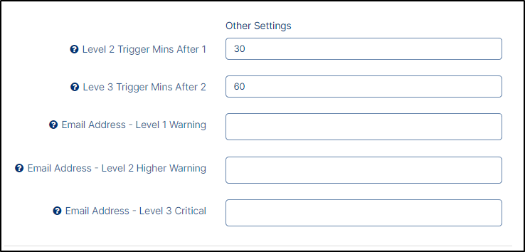 For example, if you had 30 minutes this would mean that 30 minutes after your level 1 warning, a Level 2 warning would be generated, and an email would be sent to the address you have listed in the above screenshot.