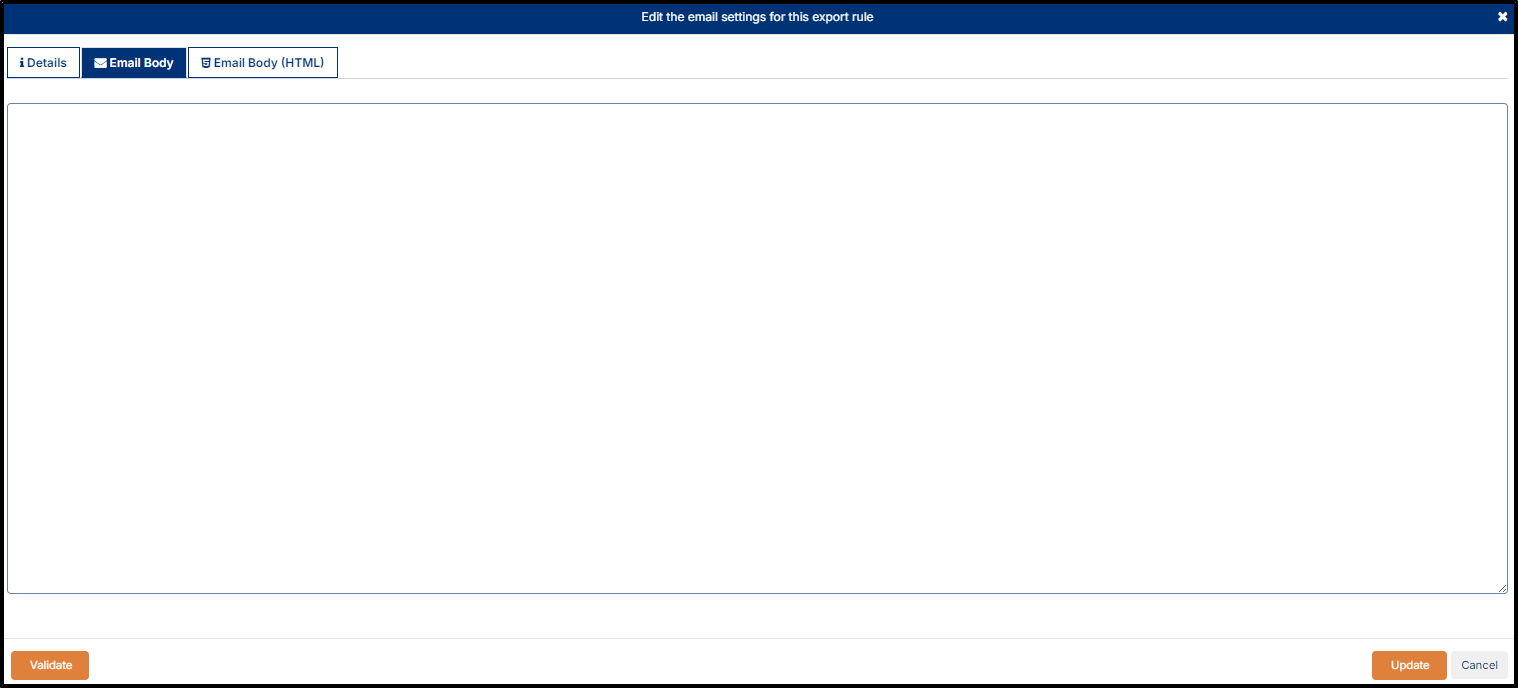 - The Email Body (HTML) tab allows you to manipulate HTML code for the email body; this is more advanced setup and is not covered in this example.