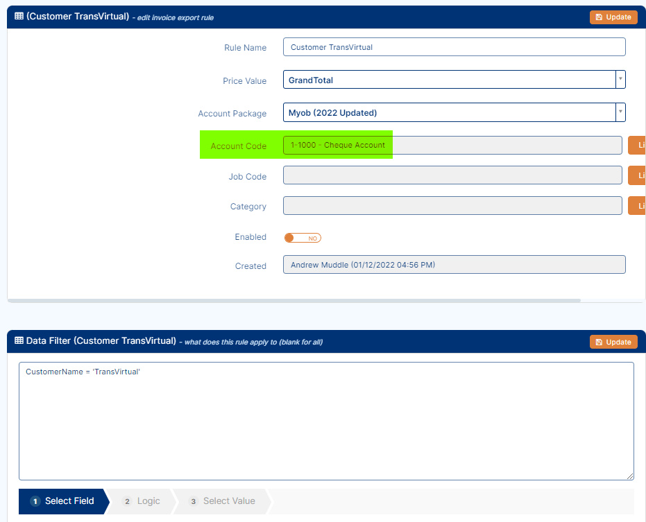 - To summarize, when invoices for customer Transvirtual are approved and locked in this account, we are going to have the Grand Total price of the invoice send to the Account Code listed against this rule. This Account Code is different to the default listed against the Accounts Package. - We would then repeat the same process for the other rule for customer TEST customer, but instead of sending to Account Code 1-1000, the invoice data will be sent to another code in the Accounts Package.