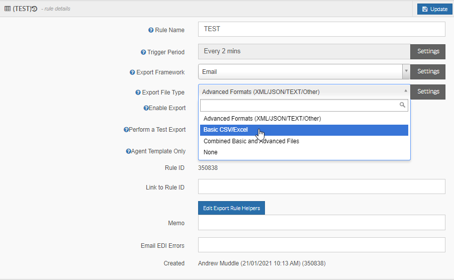 Basic/CSV export File type sends the email recipient this CSV file type. If you wish to send the customer this type of file only, select this from the list and then click update at the top.