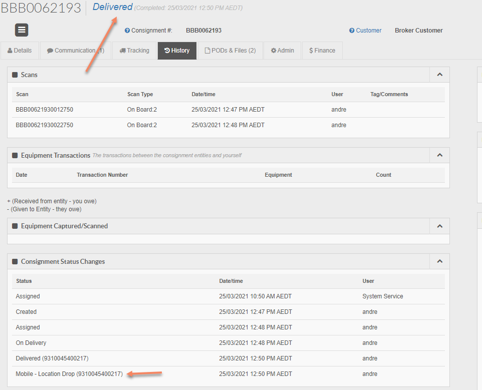 6. Complete the job as per normal. This consignment will now be completed with all relevant PODs: