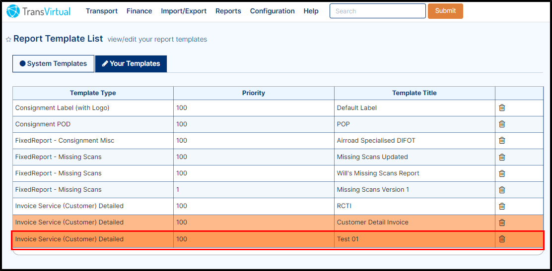 Transvirtual uses a series of report templates that are used to generate the labels, consignment note PDFs, Invoice PDFs, etc. that you see when using Transvirtual. These report templates can be customized from the default version if required.
