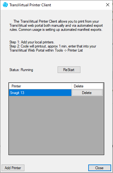 Resolution: To restart the application, navigate to Start -> All Programs -> Transvirtual Print Client -> Configuration and Status or search for Configuration and Status in your apps.