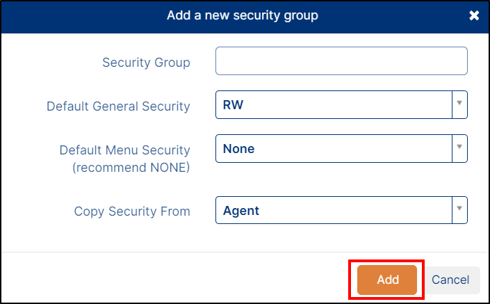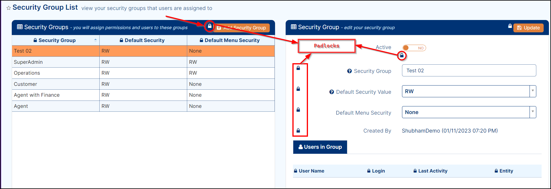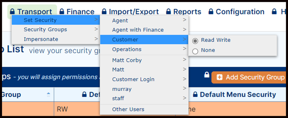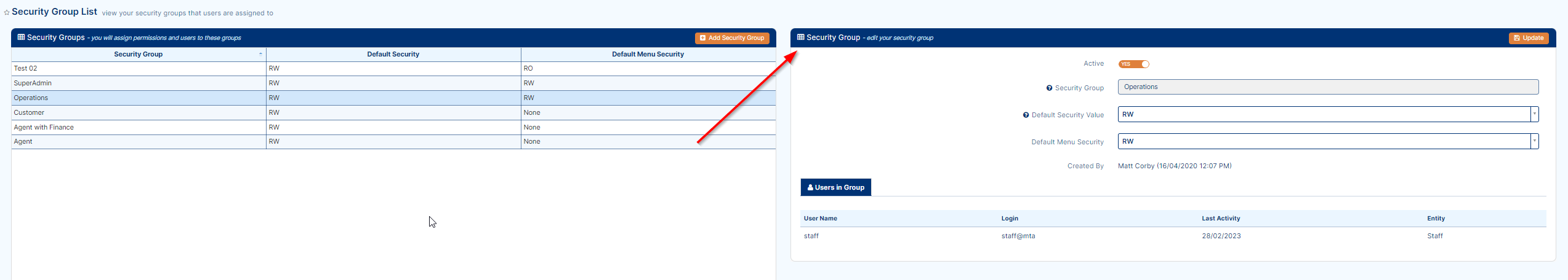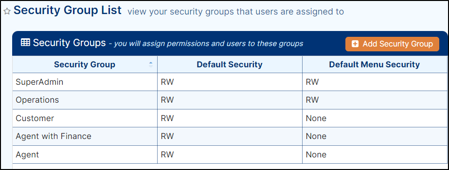 Security Groups control what users can view and edit in your account. Each group defines access permissions at the menu, page, and field level.