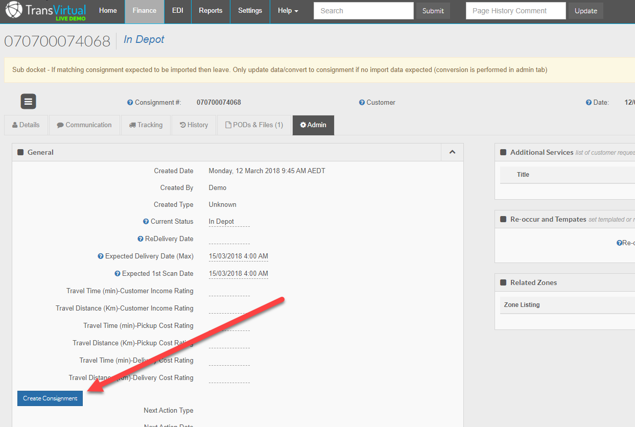 If no data is expected from your customer, you will need to update the details of the consignment sender and receiver details and ensure all the consignment item details are correct. Once this is done within the admin tab you can convert this sub-consignment to a consignment as below