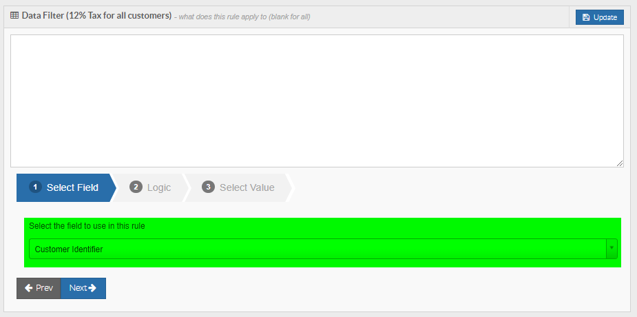 However, if you wanted to create a tax rate for a specific customer or set of customers, you would need to add logic to the Data Filter so that the tax rate would apply in the correct circumstances. To add logic to the Data Filter, use the Data Filter Builder at the bottom of the page: