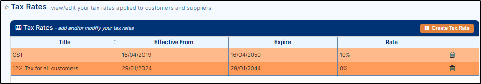 The Tax Rates feature allows you to configure how tax is applied to consignments and invoices in Transvirtual.