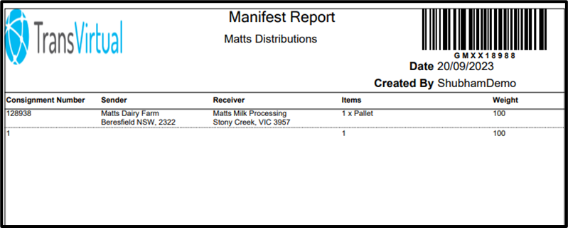 1. General Manifests (also known as consolidation manifests) are created via mobile device and are mainly used to save time. To know more how to create general manifest, click here. 2. To view this manifest, on web application go to Transport > Home > Manifests > General Manifests, this manifest will display as shown below.