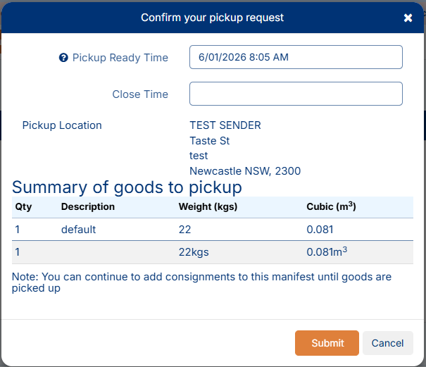 This setting automatically creates a pickup consignment linked to a manifest. The linked consignment acts as a summary of all consignments on the manifest.
