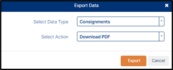 g. If needed you can print the Manifest in PDF by click on Print, Export data Popup will come on screen, now choose Select Data Type and Select Action with the help of Drop and Down button and then click on Export button as shown below.