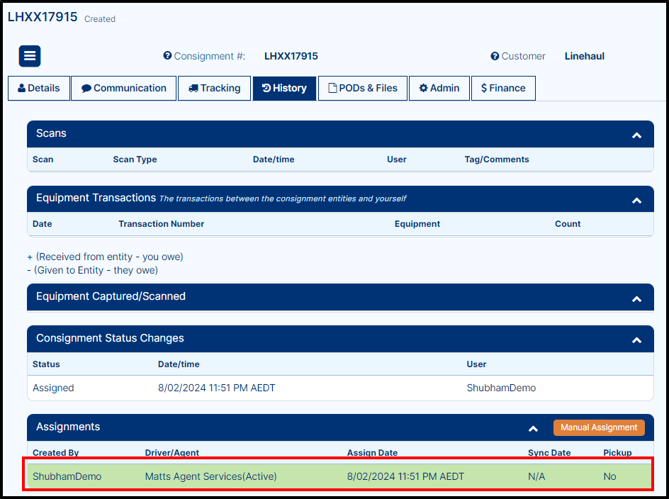 by setting up Auto-Assignment rules. Click here for instructions on how to set auto-assignment up.3. To assign a connote to an agent manually. go to consignment history tab,