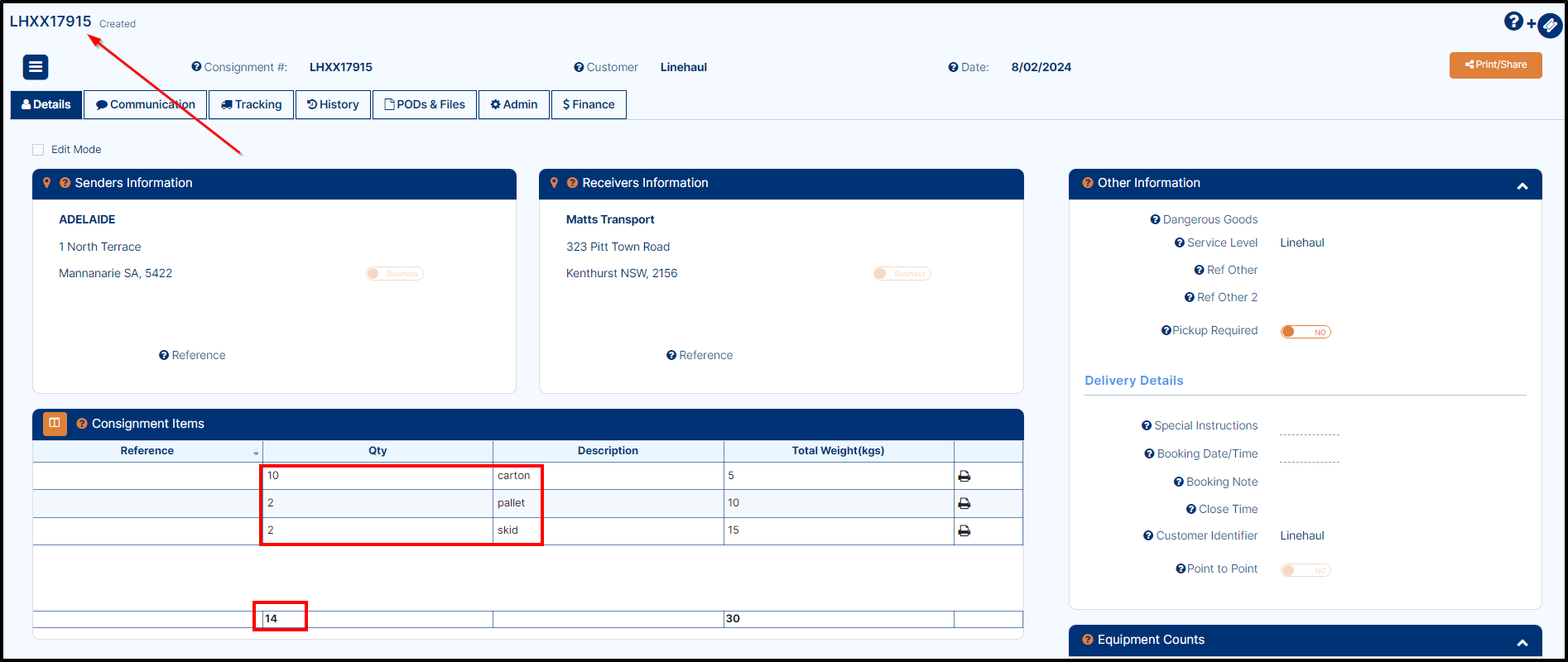 a. On Customer Manifest detail page, you can see the Manifest info, Additional info, Consignment Detail and Additional Detail.