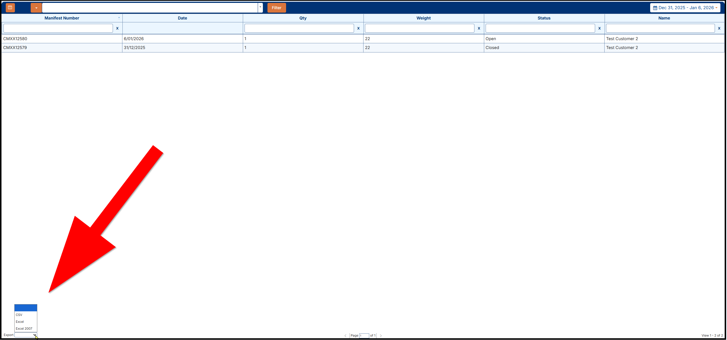 NOTE: You can Export a report of the manifests on this page by scrolling down to the bottom left corner of the page and selecting the format of that file (i.e. CSV, Excel or Excel2007):How to print or export: